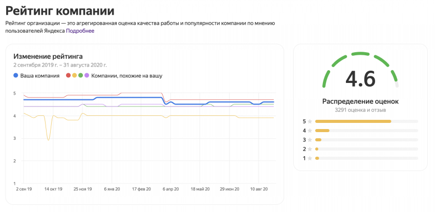 На рейтинг влияет и количество оценок: пользователи предпочитают компании с большим количеством оценок, даже если в среднем они чуть хуже. Поэтому у организаций с активной аудиторией рейтинг выше.