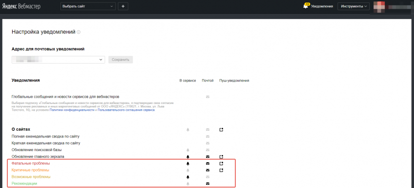 Чтобы оперативно получать отчеты об ошибках и всегда быть в курсе проблем и рекомендаций, не забудьте настроить уведомления Вебмастера. Доступный для события вид уведомлений (пуши, письма или внутри сервиса) обозначен в соответствующей колонке — нажмите на значок для активации подписки. По умолчанию мы высылаем уведомления только о фатальных и критичных ситуациях.