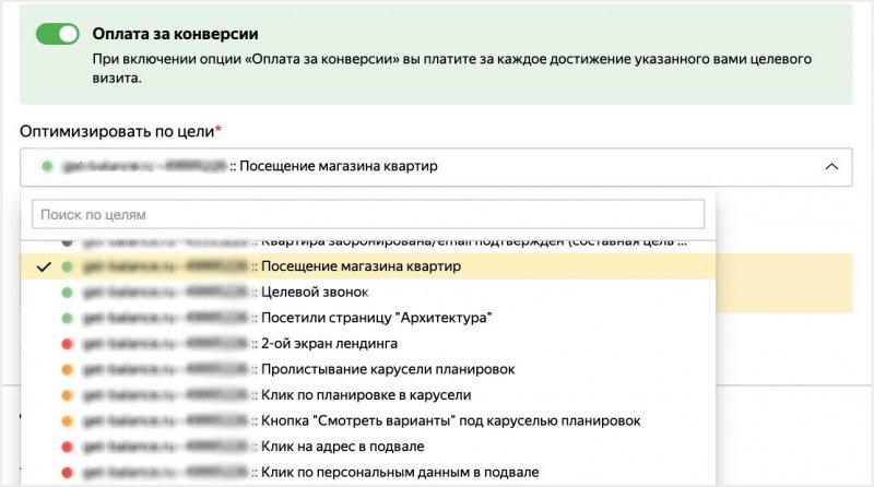 Директ поможет выбрать цель для оптимизации: покажет конверсионность целей по всем источникам трафика. Подсветит зелёным те цели, по которым можно получить больше 20 конверсий, жёлтым — от 10 до 20, красным — менее 10. Мы всегда советуем выбирать более конверсионные цели для автостратегий, а если по нужной цели конверсий не достаточно, лучше указать в настройках цель выше по воронке.