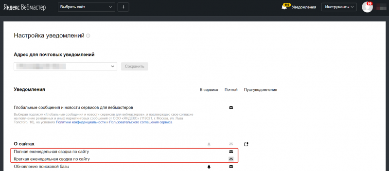 · Нажмите на почтовый конверт рядом с пунктом Еженедельная сводка по сайту.