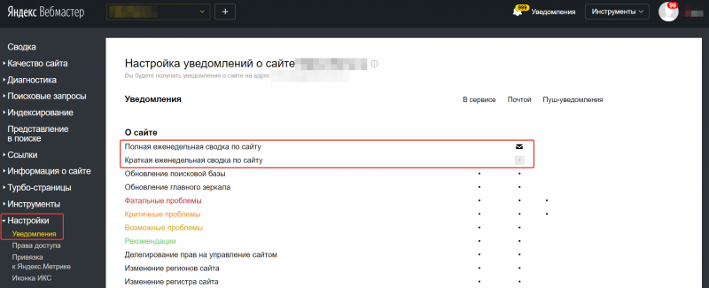 Уберите выделение с почтового конверта рядом с пунктом Краткая еженедельная сводка — так вы отпишитесь от сводки для всех сайтов.Затем выберите в Вебмастере сайт, сводку по которому хотите получать.Перейдите в раздел Настройки — Уведомления для этого сайта и выберите полную или краткую сводку.P. S. Мы хотим сделать еженедельную сводку по сайту полезнее, поэтому будем рады вашим предложениям и пожеланиям. Расскажите нам, какие данные стоит добавить, чтобы получать более информативную сводку.