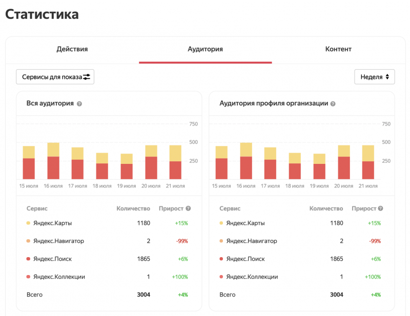 · Действия — взаимодействие пользователей с данными организации в профиле на поиске и Картах.