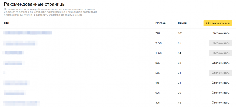 Обратите внимание: в списке рекомендованных к отслеживанию страниц с показами и кликами теперь отображаются все страницы, вне зависимости, отслеживаются они уже или нет, чтобы вы могли видеть общую статистику. Для удобства владельцев сайтов блок с 3 самыми популярными страницами теперь всегда отображается в еженедельной сводке по сайту.