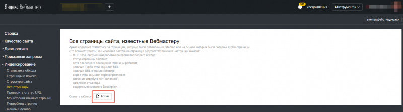 Раньше такие сведения были доступны в отчетах Вебмастера, но количество запросов или изменений на страницах ограничивалось. Теперь можно скачать архив с информацией обо всех страницах сайта без ограничений, если эти страницы добавлены в Sitemap или переведены в формат Турбо.