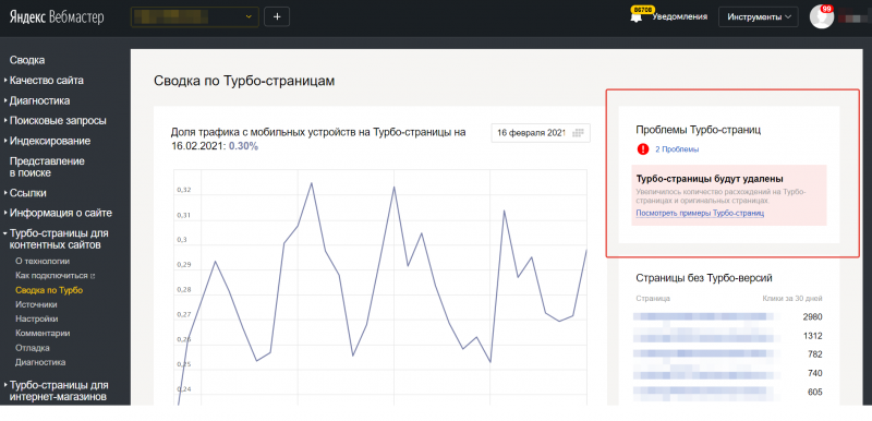 Предупреждает о снижении качества Турбо-страниц и наличии ошибок, которые нужно исправить. Если количество ошибок вырастет и они будут заметны пользователям, Турбо-страницы пропадут из поиска. Когда ошибки исправлены, нужно нажать кнопку «Проверить».