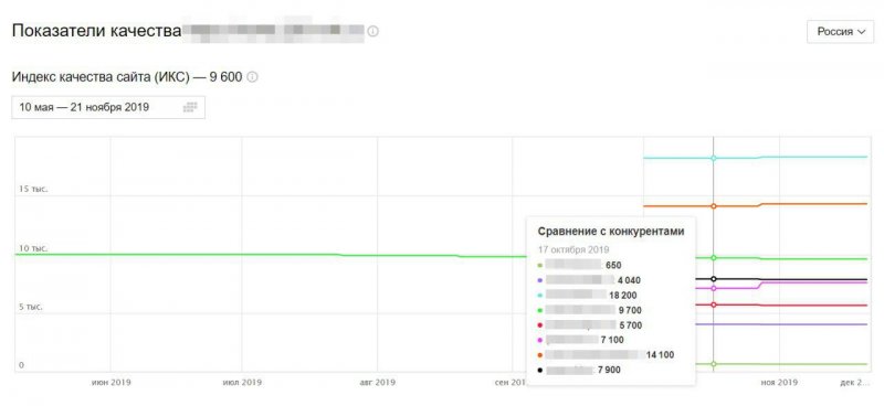3) На странице качества вы можете добавлять еще больше конкурентов (до 19 адресов сайтов) и сравнивать ИКС и другие параметры своего сайта с конкурентами, а также смотреть динамику ИКС в сравнении с конкурентами на графике. Данные ИКС своего сайта можно посмотреть за любой период, а данные ИКС конкурентов — с 20 ноября 2019 года.