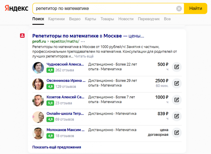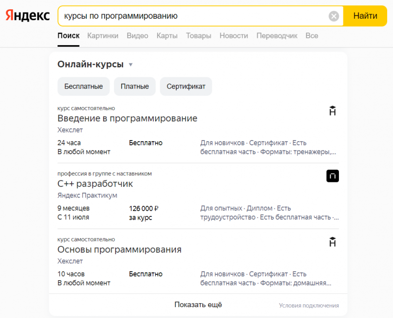 Благодаря дополненному представлению вы можете бесплатно показывать пользователям свои товары и предложения еще на этапе выдачи результатов по поисковому запросу. Карточки с ценами, фотографиями, контактами и другими необходимыми параметрами позволяют привлечь новых посетителей и целевые заказы для интернет-магазина.