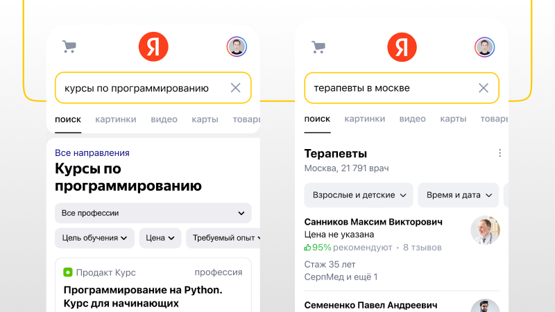 Поиск помогает находить решения, а не просто сайты. Если нужно записаться к терапевту, поиск покажет доступных специалистов, адреса клиник и цены на приём. А если захотелось научиться программировать, то поиск подскажет курсы с подходящей длительностью, нужными навыками и отзывами. А вашему сайту поможет рассказать о своих услугах прямо в поисковой выдаче.