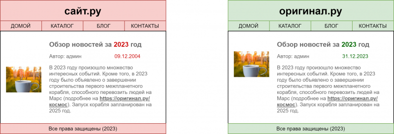 Владельцы некоторых сайтов пытаются представить свой контент оригинальным, для чего указывают заведомо неверную дату публикации в прошлом. Или другой пример: на сайте давно опубликована статья, и в неё добавляют существенный фрагмент нового контента — заимствованного. Дата написания в таком случае может не меняться, и это создаёт ощущение, что публикация на этом сайте появилась раньше оригинала. В статье также может присутствовать контент, который не мог быть создан в указанную дату (например, события, описанные в статье, ещё не произошли).