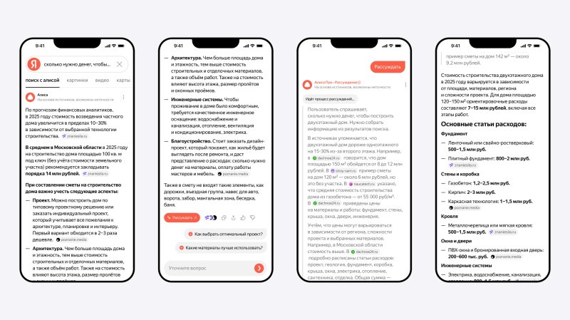 Режим рассуждений полезен, когда нужно глубже погрузиться в тему — например, понять, сколько стоит постройка двухэтажного дома и что учесть при составлении сметы. В этом режиме Алиса тратит больше времени и ресурсов на анализ информации, задействует больше источников и может представить ответ в виде таблицы для сравнения данных или более удобного отображения информации. Пользователь может посмотреть, как она подходит к задаче и какие выводы делает. Чтобы перейти в новый режим, нужно кликнуть на кнопку «Рассуждать» под ответом Алисы.