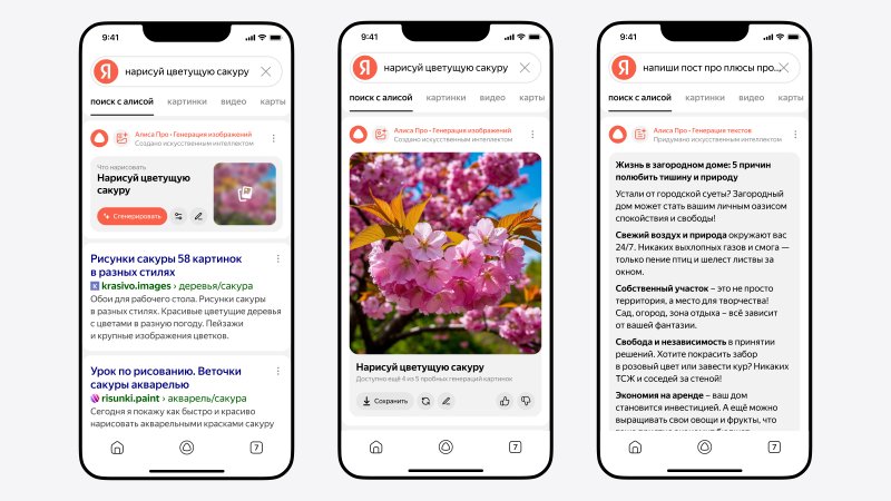 Новые возможности Поиска с Алисой доступны всем пользователям. Чтобы все желающие могли бесплатно использовать режим рассуждений и генерации картинок, существуют ограничения по числу запросов. Это помогает дать максимально широкий доступ к нейросетевым технологиям. Подписчики опции «Алиса Про» могут включать режим рассуждений и генерировать изображения без ограничений. Также в рамках опции «Про» тексты генерирует самая мощная нейросеть Яндекса последнего поколения — YandexGPT 5 Pro.