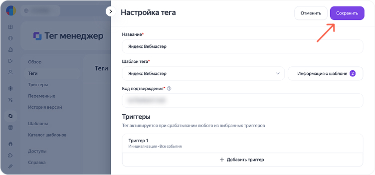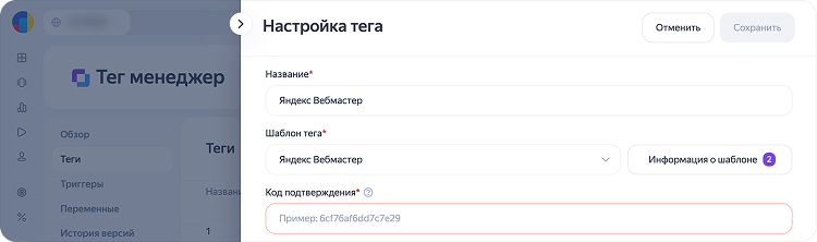 Укажите название тега — выберите шаблон Яндекс Вебмастер. Скопируйте код подтверждения из вашего личного кабинета в Яндекс Вебмастере и вставьте его в поле «Код подтверждения».