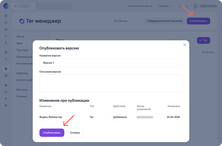 Чтобы тег начал работать на сайте, недостаточно просто сохранить его. Нажмите кнопку «Опубликовать» в правом верхнем углу, добавьте комментарий к версии (например, «Добавление верификации Яндекс») и нажмите «Опубликовать».