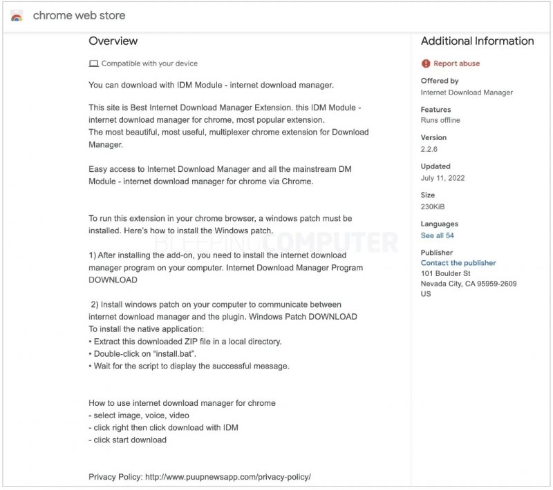 Инструкции, опубликованные вместе с поддельным расширением, вызывают недоумение, так как после установки расширения пользователям предлагают установить исполняемый файл с сайта puupnewsapp (puupnewsapp[.]com/idman638build25.exe), а также дополнительно загрузить ZIP-файл с «исправлением для Windows» (puupnewsapp[.]com/windows.zip).
