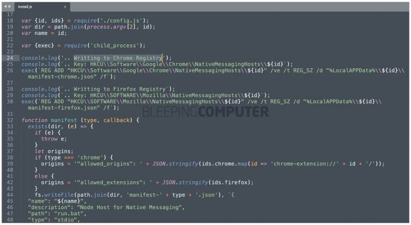 И если файл idman638build25.exe представляет собой настоящую и подписанную версию легитимного Internet Download Manager от Tonec, то архив windows.zip, изученный Bleeping Computer, содержит как 32- и 64-битные версии NodeJS и выполняет jаvascript-код для настройки параметров реестра, связанных с Chrome и Firefox.