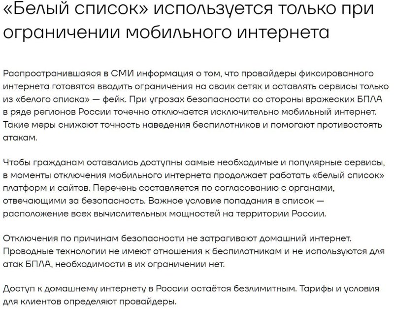 В ведомстве пишут, что при угрозах безопасности со стороны БПЛА в ряде регионов России точечно отключают исключительно мобильный интернет. Но проводные технологии не имеют отношения к беспилотникам, а значит, необходимости в их ограничении попросту нет. В министерстве подчеркнули, что доступ к домашнему интернету в РФ остается безлимитным.