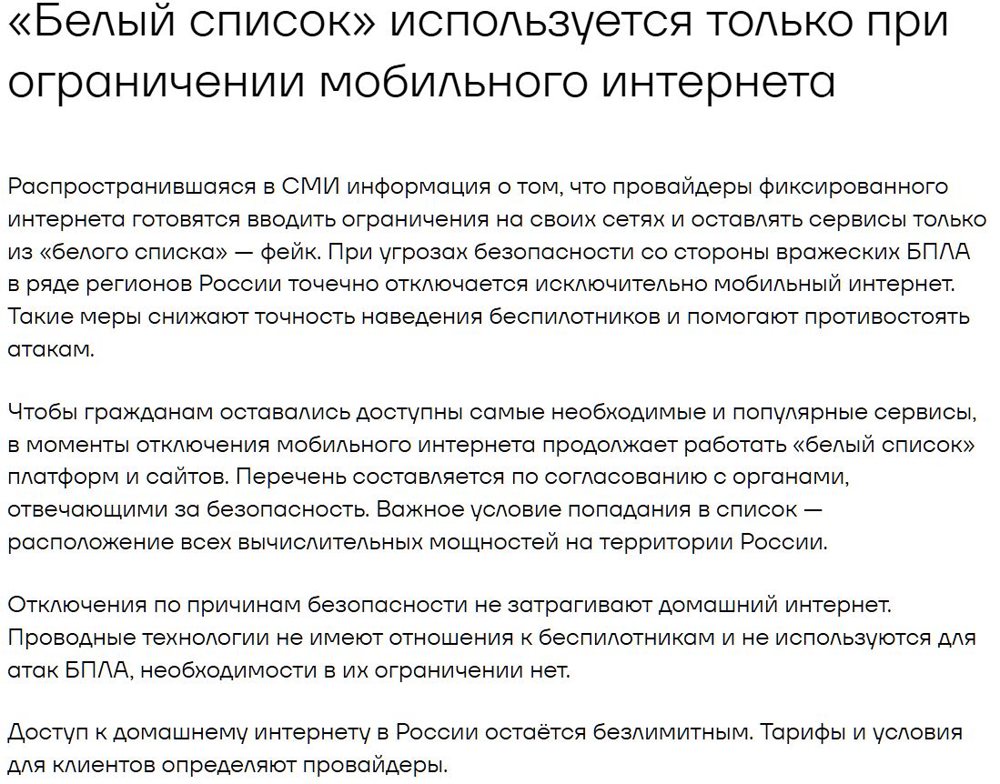 В конце прошлой недели Telegram-канал Mash сообщил, что провайдеры домашнего интернета в Москве якобы срочно внедряют систему «белых списков» — аналогичную той, что уже работает на мобильных сетях. Представители Минцифры и операторов связи опровергли эту информацию и назвали публикацию «фейком».