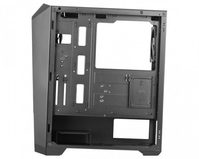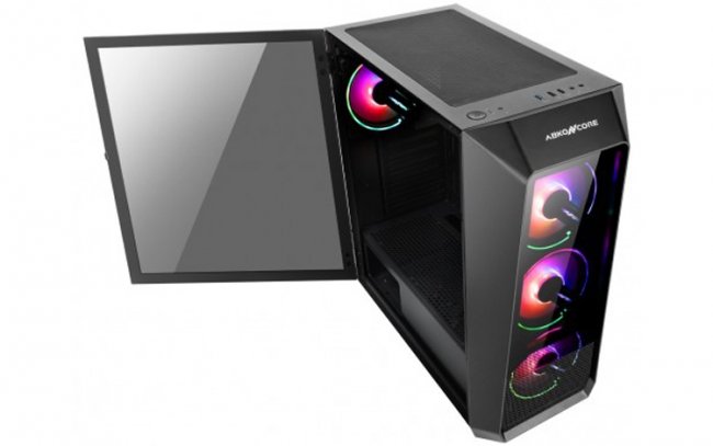 Новинка полностью выполнена в чёрном цвете. Особенность изделия — гибридная фронтальная панель: её нижняя секция имеет сетчатое исполнение, а остальная часть закрыта закалённым стеклом. Из стекла также изготовлена боковая стенка.