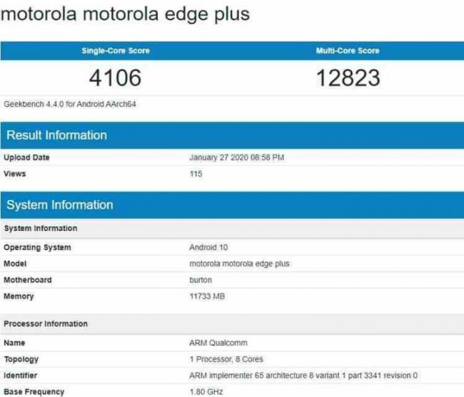 Смартфон тестировался под именем «motorola motorola edge plus». Несмотря на то, что конкретные указания на используемый чип отсутствуют, с большой долей уверенности можно сказать, что аппаратной основой смартфона является однокристальная система Qualcomm Snapdragon 865. Это предположение подтверждается номинальной частотой функционирования 8-ядерного чипа, которая равна 1,8 ГГц, а также показателями, полученными в ходе тестирования в одноядерном и многоядерном режимах (4106 баллов и 12 823 балла соответственно). Производительный процессор дополняется 12 Гбайт оперативной памяти. В качестве программной платформы используется Android 10.