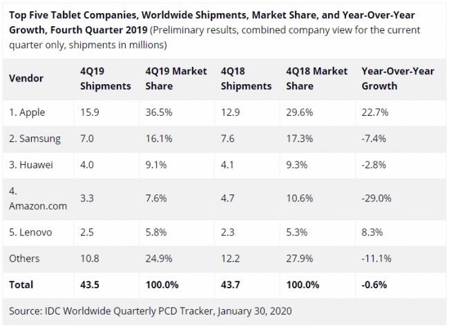 Глобальный рынок планшетных компьютеров показал спад как по итогам прошлого квартала, так и по итогам 2019 года в целом. Об этом говорят данные, обнародованные компанией International Data Corporation (IDC). За трёхмесячный период отгрузки планшетов составили 43,5 млн штук. Это на 0,6 % меньше результата 2018 года, когда поставки равнялись 43,7 млн единиц. Учитываются продажи как обычных планшетов, так и гаджетов с присоединяемой клавиатурой. Более трети рынка — 36,5 % — в прошлом квартале заняла Apple: компания реализовала 15,9 млн различных моделей iPad. Спрос на эти гаджеты в годовом исчислении поднялся на 22,7 %. На втором месте с 7,0 млн отгруженных устройств и долей 16,1 % находится Samsung. Правда, спрос на планшеты этой компании за год уменьшился на 7,4 %. Замыкает тройку Huawei — 4,0 млн реализованных планшетов и 9,1 % рынка. Продажи компании упали в годовом исчислении на 2,8 %. За 2019 год в целом в мире было поставлено 144,1 млн планшетных компьютеров. Падение по отношению к 2018-му составило 1,5 %. В тройку лидеров входят Apple, Samsung и Huawei с долями соответственно 34,6 %, 15,1 % и 9,8 %.
