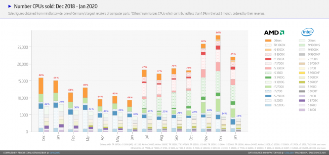Квартальный отчёт Intel заставил руководство компании признаться, что объёмы реализации настольных процессоров за 2019 год сократились на 6 %, хотя средняя цена при этом выросла на 3 %. Если же рассматривать в отдельности динамику второго полугодия, то средняя цена реализации настольных процессоров Intel неуклонно снижалась. Все эти тенденции отразились и на статистике немецкого интернет-магазина MindFactory.de. Можно лишь отметить, что в натуральном выражении доля продукции AMD по сравнению с декабрём сократилась с 86 % до 85 %.