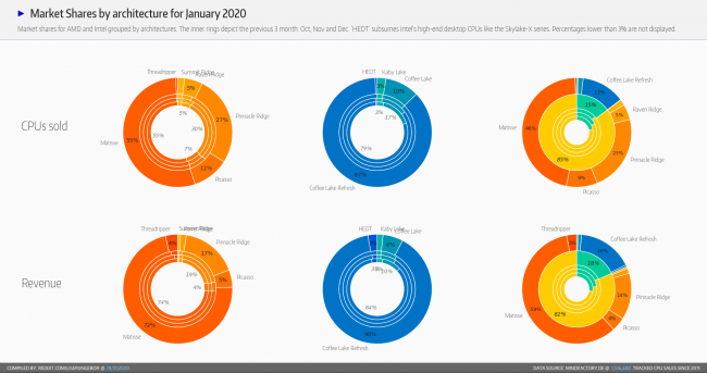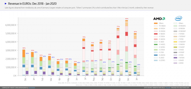 В показателях выручки процессоры AMD удерживают те 82 %, которые они заняли в декабре. Фавориты — примерно те же, что и в предыдущем абзаце, но с некоторым перераспределением долей в пользу более дорогих моделей.