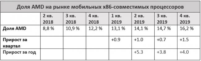 За последний квартал 2019 года доля AMD на рынке мобильных x86-совместимых процессоров увеличилась на 1,5 процентных пункта, что не только является самым большим квартальным скачком в 2019 году, но и превышает прирост доли AMD в настольном сегменте в пять раз. В годовом же исчислении доля «красных» увеличилась на 4 процентных пункта. В итоге на конец 2019 года мобильные процессоры AMD заняли 16,2 % рынка, что является весьма неплохим показателем.