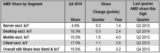 Компания AMD уже девятый квартал подряд увеличивает свою долю на рынке x86-совместимых процессоров. Об этом сообщается в свежем отчёте по рынку центральных x86-процессоров для серверов, настольных и мобильных ПК от крупного аналитического агентства Mercury Research, которое подвело итоги продаж процессоров за четвёртый квартал 2019 года. Однако в настольном и серверном сегментах рост доли AMD оказался не слишком значительным по сравнению с предыдущим кварталом, хотя и весьма ощутимым по сравнению с тем же периодом прошлого года. Куда более заметный прирост у AMD наблюдается в сегменте мобильных процессоров, как в годовом, так и в квартальном выражении. Это является хорошим признаком для AMD, ведь ноутбуки занимают около 2/3 потребительского рынка CPU. Но сосредоточимся на сегменте процессоров для настольных ПК. По данным аналитиков, в последнем квартале 2019 года и AMD, и Intel увеличили объёмы продаж десктопных процессоров. Особенно сильный рост показали процессоры обеих компаний верхнего ценового сегмента с большим числом ядер, а у Intel к тому же увеличились и поставки чипов начального уровня. В результате, AMD смогла увеличить своё присутствие на рынке на 0,3 процентных пункта по сравнению с прошлым кварталом. Не самый значительный прирост, который оказался явно ниже ожиданий, появившихся на фоне того, что во время крупных ноябрьских распродаж процессоры AMD уверенно занимали весь топ-10 самых популярных CPU на Amazon. Это в очередной раз доказывает, что розничный рынок намного меньше, что сегмент готовых настольных систем, где Intel по-прежнему сохраняет убедительное лидерство. Как отмечают некоторые производители материнских плат, системы на Intel чаще всего покупают для использования в офисах и государственных учреждениях, которые попросту не хотят проводить дорогостоящую повторную валидацию своего ПО под работу на другой платформе. В целом же на конец 2019 года доля AMD в настольном сегменте составила 18,3 %, что на 2,4 процентных пункта больше по сравнению с показателем конца прошлого года. Тут же напомним, что согласно последнему финансовому отчёту AMD, выручка от продаж процессоров Ryzen и видеокарт Radeon за 2019 составила $4,7 млрд, что на 69 % больше по сравнению с прошлым годом. Отсюда можно сделать вывод, что AMD довольно ощутимо увеличила среднюю цену реализации своих потребительских продуктов. Этому явно поспособствовала популярность новых настольных процессоров Ryzen 9. Впрочем, Intel за один лишь четвёртый квартал 2019 года заработала на настольных CPU около $10 млрд.