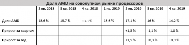 Общий тезис об укреплении позиций AMD на рынке процессоров не противоречит некоторым обоснованным исключениям. Специалисты Mercury Research отметили, что на совокупном рынке процессоров с учётом сегмента IoT и полузаказных решений доля компании в четвёртом квартале сократилась. Это может говорить о росте популярности полузаказных процессоров Intel.