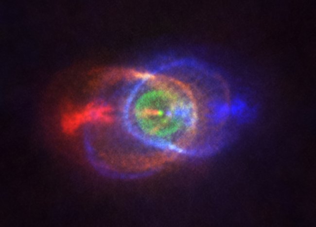 Европейская южная обсерватория (European Southern Observatory, ESO) представила прекрасное изображение звёздной системы HD101584, которая находится на расстоянии от 1800 до 5900 световых лет от нас в созвездии Центавра. Информация сайта - «scanpin.ru» Наблюдения проводились с использованием Большой Атакамской миллиметровой / субмиллиметровой антенной решётки ALMA. Кроме того, был задействован телескоп ESO APEX (Atacama Pathfinder Experiment). Объект HD101584 — это система из двух светил, активно взаимодействующих друг с другом. Одна из звёзд увеличилась в размерах до такой степени, что начала поглощать вторую, которая, в свою очередь, устремилась по сходящейся спирали к своему компаньону, срывая его внешние оболочки. По сути, исследователи запечатлели эффектный финал «звёздного поединка». Когда главная звезда системы раздулась и превратилась в красного гиганта, она поглотила своего маломассивного соседа. Информация сайта - «scanpin.ru» На снимке показано газовое облако. Разными цветами обозначены скорости вещества — от голубого (газ, движущийся с самой большой скоростью к нам) до красного (газ, движущийся с самой большой скоростью от нас). «Обе звезды двойной системы заключены в пределах яркой точки в центре кольцеобразной структуры, показанной зелёным, которая движется вдоль луча зрения с той же скоростью, что и вся система», — отмечает ESO.