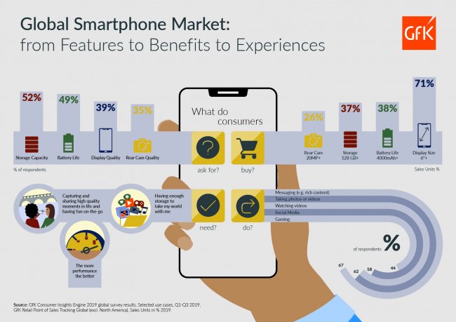 Компания GfK представила результаты исследования, в ходе которого изучались покупательские тенденции на мировом рынке смартфонов в 2019 году. Кроме того, сделан прогноз по развитию отрасли на текущий год.