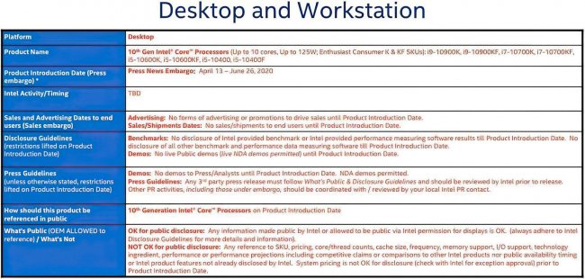 Что касается сроков выхода новых процессоров, то похоже, они ещё окончательно не определены даже самой Intel, потому как опубликованный слайд из презентации компании содержит лишь примерные сроки окончания запрета на публикацию обзоров новинок. Производитель выделил окно более чем в два месяца, которое начинается 13 апреля и заканчивается 26 июня. То есть когда-то в этот промежуток времени выйдут обзоры новинок, а соответственно и сами чипы поступят в продажу.