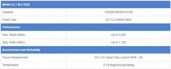 Но вернёмся к накопителям CL1. Они выполнены в формате M.2 2230 — габариты составляют 22 ? 30 мм. Применены микрочипы флеш-памяти 3D TLC NAND и контроллер Silicon Motion SM2263XT.