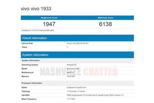 Между тем в базе Geekbench появилась информация о загадочном смартфоне Vivo 1933. Это устройство несёт на борту чип Snapdragon 710 (восемь ядер Kryo 360 с тактовой частотой до 2,2 ГГц и графический ускоритель Adreno 616) и 8 Гбайт оперативной памяти. Наблюдатели полагают, что к выпуску готовится новый аппарат на базе модели Vivo Z5x.
