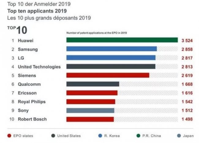 Европейское патентное ведомство опубликовало данные о количестве зарегистрированных в прошлом году заявок на получение патентов. В общей сложности ведомство получило в 2019 году свыше 181 000 заявок на патенты, что на 4 % больше по сравнению с предыдущим годом. Наибольшую активность проявляла китайская компания Huawei. В отчёте сказано о том, что количество регистрируемых китайскими компаниями патентов за год выросло на 29,2 % и составило 12 247 единиц. Благодаря этому Китай поднялся на 4 строчку в рейтинге стран, оформивших больше всего патентов в 2019 году. США, Германия и Япония располагаются в верхней части этого рейтинга. Что касается отдельных компаний, то на первой строчке рейтинга находится китайская компания Huawei, которая оформила 3524 заявок на получение патентов. Второе и третье места занимают южнокорейские Samsung и LG, зарегистрировавшие 2858 и 2817 заявок соответственно. Успех Huawei не выглядит удивительным, поскольку телекоммуникационный гигант вкладывает огромные деньги в исследования и разработку новых технологий. Согласно имеющимся данным, в 2018 году направление НИОКР было проинвестировано на общую сумму свыше $15 млрд. В сообщении упоминается, что по итогам 2019 года Государственное ведомство интеллектуальной собственности КНР получило более 14 млн патентных заявок на изобретения. При этом одобрены были только около 453 000 заявок. Отмечается, что число выданных в Китае патентов на изобретения выросло на 4,8 % в годовом исчислении, а количество зарегистрированных товарных знаков увеличилось на 27,9 %.