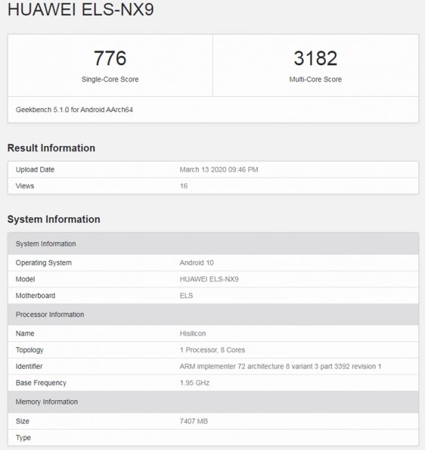 Тестирование в Geekbench прошёл один из представителей семейства флагманских смартфонов Huawei P40, официальная презентация которых состоится 26 марта на специальном мероприятии в Париже (Франция). Аппарат имеет шифр ELS-NX9: сообщается, что под этим обозначением скрывается модель Huawei P40 Pro 5G с поддержкой мобильных сетей пятого поколения. «Сердце» смартфона — восьмиядерный процессор HiSilicon с базовой тактовой частотой 1,95 ГГц. Веб-источники уточняют, что задействован фирменный чип Kirin 990 5G. Объём оперативной памяти составляет 8 Гбайт. По всей видимости, будет также выпущена модификация с 12 Гбайт ОЗУ. Операционная система — Android 10. В одноядерном тесте Geekbench 5.1.0 новинка показала результат в 776 баллов, в многоядерном — 3182 балла. Известно, что аппарат будет оборудован пятикомпонентной тыльной камерой, в состав которой войдут сенсоры с 52 млн и 40 млн пикселей, блок-перископ (обеспечит 10-кратный оптический зум) и датчик ToF. Во фронтальной части расположится двойная селфи-камера. Устройству приписывают наличие качественного дисплея с частотой обновления 120 Гц и аккумулятора ёмкостью 5000 мА·ч. Наконец, упомянут симметричный порт USB Type-C.