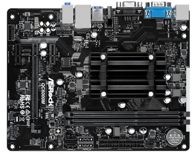 Сама материнская плата ASRock QC6000M оснащена двумя слотами для модулей памяти DDR3 с частотой до 1600 МГц и общим объёмом до 32 Гбайт. Набор слотов расширения включает два PCIe 2.0 x1 и один PCIe 2.0 x16. Для подключения устройств хранения данных есть только пара портов SATA III. На процессор установлен относительно крупный радиатор для пассивного охлаждения.