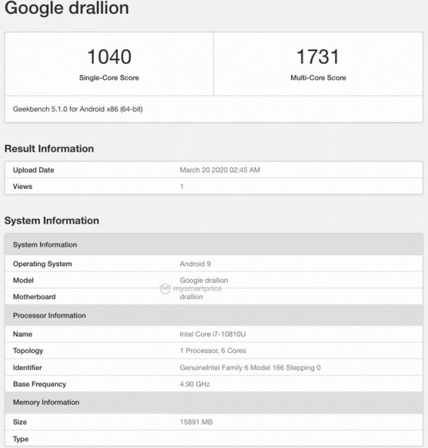 Любопытно, что в данных Geekbench в качестве операционной системы называется Android 9. Но интернет-источники сообщают, что это неточность: на деле применяется именно Chrome OS, на что указывают более ранние утечки и факт использования производительного чипа Core i7.