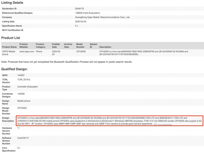 Кроме того, сообщается, что на сайте организации Bluetooth SIG «засветился» смартфон OPPO с обозначением CPH2005. Эта модель получит процессор Snapdragon 765G, обеспечивающий поддержку сетей 5G.