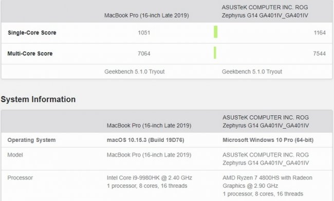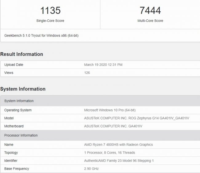 Хотя компания AMD представила мобильные процессоры Ryzen 4000 (Renoir) ещё в начале года, а более полную презентацию провела ранее на этой неделе, ноутбуки на их основе всё ещё не поступили в продажу. Многочисленные намёки указывают, что случится это к концу марта, а пока что мы может продолжать узнавать подробности о новинках из утечек. На этот раз в базе данных теста производительности Geekbench 5 обнаружилась запись о тестировании ноутбука ASUS ROG Zephyrus G14 GA401IV на процессоре Ryzen 7 4800HS. Напомним, что Zephyrus G14 является 14-дюймовым игровым ноутбуком среднего ценового сегмента, который сочетает в себе компактность и весьма производительное «железо». Протестированная здесь модель помимо почти флагманского процессора AMD Renoir также предлагает 16 Гбайт оперативной памяти и видеокарту GeForce RTX 2060. Что касается процессора Ryzen 7 4800HS, то он, напомним, обладает восемью ядрами и шестнадцатью потоками. Его базовая тактовая частота составляет 2,9 ГГц, и он способен динамически разгоняться вплоть до 4,2 ГГц. Уровень TDP данного процессора, как и у других моделей Ryzen HS-серии, составляет 35 Вт. Ещё тут есть встроенная графика Vega второго поколения с семью вычислительными блоками. В базе бенчмарка Geekbench 5 обнаружилось две записи о тестировании вышеописанной системы. В тестах производительности одного ядра результаты составили 1135 и 1164 балла, тогда как многопоточный тест оценил производительность в 7444 и 7544 балла. Для сравнения, актуальный флагманский процессор Intel Core i9-9980HK, также с 8 ядрами, 16 потоками, но частотами до 5 ГГц, показывает в среднем результаты 1183 и 6879 баллов соответственно для одно- и многопоточных нагрузок.