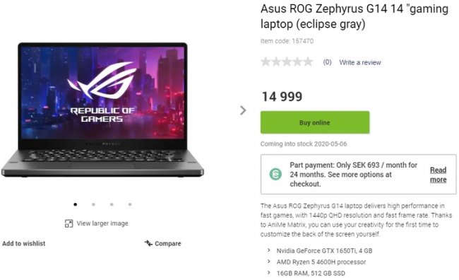 Данный 14-дюймовый игровой ноутбук с 16 Гбайт ОЗУ, 512 Гбайт SSD и видеокартой NVIDIA GeForce GTX 1650 Ti выставлен по цене 15 тыс шведских крон, что примерно соответствует $1450 или 115 500 рублей. В качестве даты начала поставок указано 5 мая 2020 года.