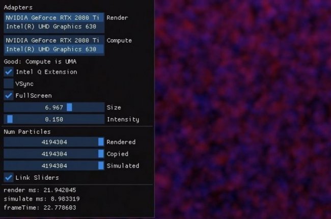 В проведённых симуляциях работа над вычислениями (с вычислительными шейдерами) была отдана встроенному графическому процессору, тогда как на дискретную видеокарту легла лишь обработка графики. Ещё по словам Intel разные GPU могут оказаться эффективны в асинхронных нагрузках, например, при работе с искусственным интеллектом, моделировании частиц и теней, расчётах физики и т.д.