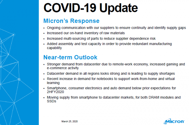 Одной из главных проблем в ситуации с коронавирусом, если не считать угрозу для здоровья и жизни людей, генеральный директор Micron Санджей Мехротра (Sanjay Mehrotra) назвал нарушение логистических и производственных связей. Компании приходится проводить дополнительные переговоры с поставщиками, чтобы обеспечить бесперебойное снабжение производства материалами и компонентами. Запасы сырья, необходимого для выпуска микросхем памяти, Micron была вынуждена увеличить. Количество поставщиков тоже возросло, чтобы снизить зависимость от конкретных партнёров в условиях неопределённости. На всякий случай введены дополнительные мощности по тестированию и упаковке продукции.