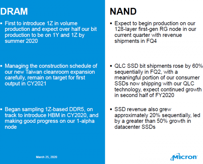 В ближайшее время руководство Micron ожидает роста спроса на память для серверов, поскольку в Китае это уже наблюдается после перехода многих граждан на дистанционную работу и обучение. Производитель даже вынужден был перебросить ресурсы с направления смартфонов, чтобы выпускать больше памяти для серверов. Ноутбуки тоже пользуются повышенным спросом в условиях самоизоляции. Не исключено, что возникнет дефицит памяти, используемой в серверах. Ситуация усугубляется тем, что некоторые предприятия приходится временно останавливать — так, например, произошло в Малайзии, где этого потребовали местные власти.