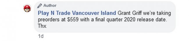 Магазин Play 'N Trade Vancouver опубликовал на своей странице в Facebook объявление о том, что он начинает принимать предварительные заказы на PlayStation 5 и обещает приступить к отправке заказы в четвёртом квартале текущего года. Но самое интересное, что продавец указал и цену новой консоли — 559 канадских долларов, что примерно равно 400 долларам США или 31 000 рублей.