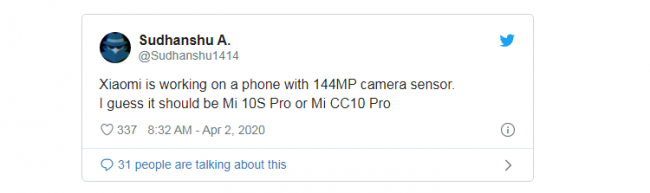 Xiaomi была в числе первых компаний, выпустивших смартфоны с 48-Мп камерой в 2019 году. Позже она выпустила Redmi Note 8 Pro с 64-Мп сенсором, а также Mi CC9 Pro со 108-Мп камерой. Теперь, по словам блогера Sudhanshu A, китайская компания работает над мобильным устройством с 144-Мп камерой.
