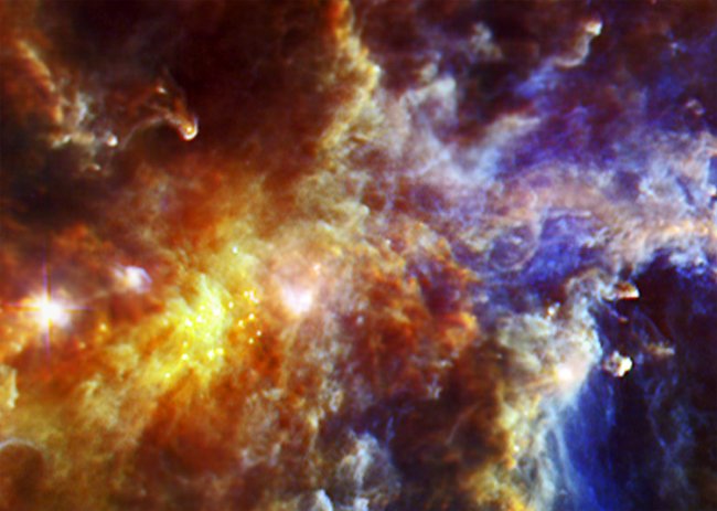 Яркие пятна на фотографии — огромные «коконы», содержащие «эмбрионы» звёзд. Некоторые из этих светил в перспективе на порядок превзойдут по массе наше Солнце.