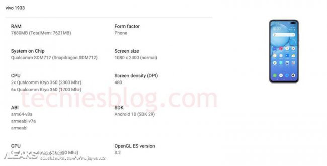 Модель Vivo V19 получит процессор Qualcomm Snapdragon 712 с восемью вычислительными ядрами и графическим ускорителем Adreno 616. Объём оперативной памяти значится в размере 8 Гбайт. Смартфон будет оснащён дисплеем формата Full HD+ (2400 ? 1080 точек), но размер этой панели не уточняется. Предполагается, что питание обеспечит аккумуляторная батарея ёмкостью 4500 мА·ч. Операционная система — Android 10.