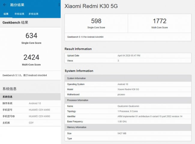 Из этого распределения сразу ясно, что Kirin 820 5G является более мощным процессором, поскольку у него четыре ядра Cortex-A76, а у Snapdragon 765G всего два. Это подтверждают и тесты Geekbench. Как видно, результаты Kirin 820 5G в Honor 30S значительно выше (634 балла в одноядерном и 2424 балла — в многоядерном режимах), чем у Snapdragon 765G в Redmi K30 5G (598 и 1772 балла соответственно):