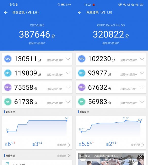 В приведённых тестах производительности Honor 30S (Kirin 820 5G) существенно обходит OPPO Reno3 Pro 5G (Snapdragon 765G) не только в области ГП и ЦП, но и в других направлениях. Да, номера версий AnTuTu не совпадают, но это не существенно: Kirin 820 5G и в других условиях явно продемонстрировал бы своё превосходство.